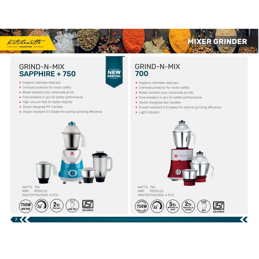 The Kitchenette Collection Grind-N-Mix Sapphire + 750 is a newly arrived, efficient mixer grinder designed for reliable performance. It features hygienic stainless steel jars for safe and durable food preparation and an overload protector for motor safety. The break-resistant polycarbonate jar lid ensures durability during use. Flow breakers within the jars are designed to improve grinding performance, ensuring consistent results. The high vacuum feet provide better stability during operation. The mixer grinder boasts stylish designed P.P. handles for a comfortable grip, and its impact-resistant S.S blades are engineered for optimal grinding efficiency. It comes with a 3+1 jar set, indicating the inclusion of an extra blending or chutney jar for added convenience.