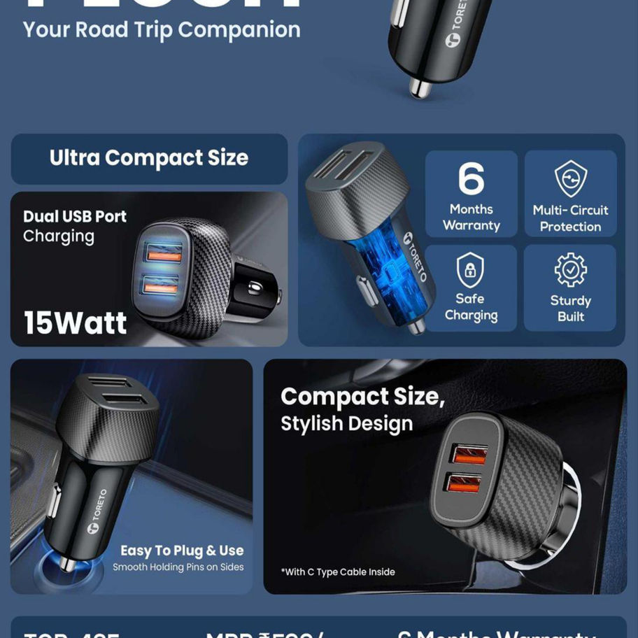 The Toreto Plush (TOR-425) is an ultra-compact and stylish car charger designed to be your ideal "Road Trip Companion." It features dual USB ports, allowing you to conveniently charge two devices simultaneously with a total output of 15 Watts.